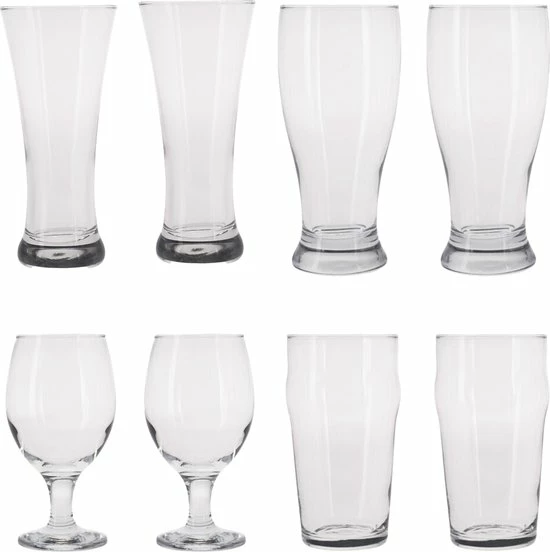 Bierglazen set voor speciaal bier 8x stuks in 4 verschillende soorten. Je ontvangt 2 stuks per bierglas soort, geschikt voor verschillende biersoorten zoals speciaal bier. Inhoud: 2x 400 ml, 2x 380 ml, 2x 565 ml en 2x 570 ml. Materiaal: glas. Geschikt voor in de vaatwasser.