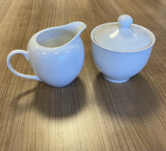 Melk en suiker set wit van porselein. Set bestaande uit een melkkannetje en een suikerpotje met deksel. Formaat melkkannetje 12 x 9 cm. Formaat suikerpotje: 9,5 x 9,5 cm.
