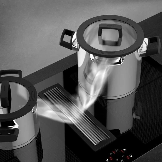 Deze potten en pannen zijn geschikt voor alle kookplaten, afzuigkappen en systemen. Ze zorgen voor een gecontroleerde stoomuitlaat en sturen de stoom rechtstreeks van de pot naar het afzuigsysteem. Dit elimineert niet alleen geurtjes, maar minimaliseert ook warmteverlies voor energiezuiniger koken. De potten en pannen worden geleverd met een glazen afdekking, met geïntegreerde luchtkanalen, in de siliconenrand om de luchtstroom te stimuleren. Het deksel kan worden gebruikt om de pan te sluiten, het verwarmingsproces te versnellen, een lagedrukkoker te creëren en warmte en smaak te behouden. Wanneer u het 180 ° draait, worden lucht en stoom rechtstreeks naar het uitlaatsysteem afgevoerd.