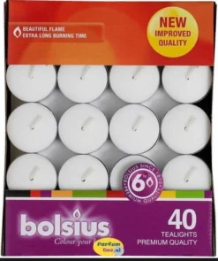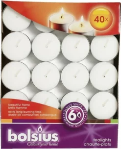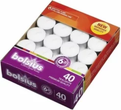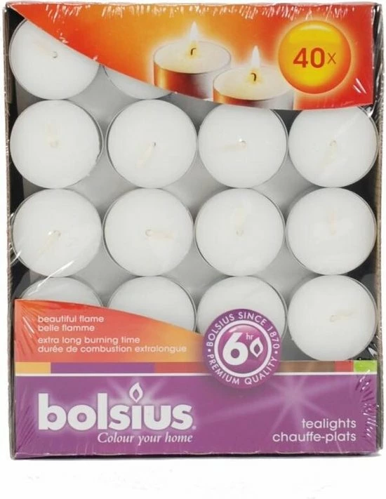 | Verpakkingsinhoud | 40, stuks, theelicht, 6, branduren, Bolsius, premium, quality |