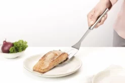 Een stijlvolle keuken met een Brabantia Profile Bakspaan. Overtollig braadvet hoort niet bij een lekkere maaltijd. Deze bakspaan, van veerkrachtig roestvrij staal, is zo gemaakt dat het teveel aan vet door de sleuven weg kan.
