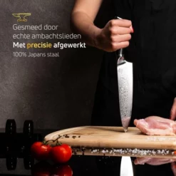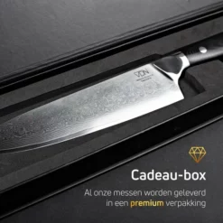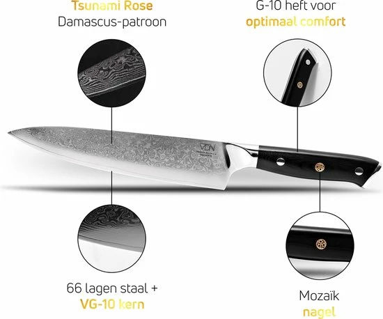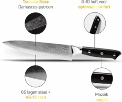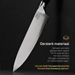 Oersterk-materiaal: Gemaakt van sterk geïmporteerd Japans VG-10 staal als kern, met daar omheen 66 lagen koolstofarme en roestvrijstalen lagen. Het mes heeft een prachtig Tsunami Rose Damascus-patroon.
