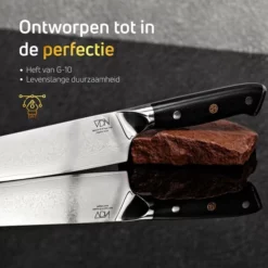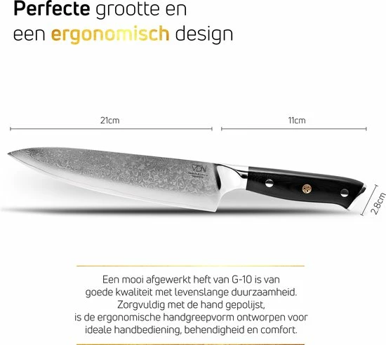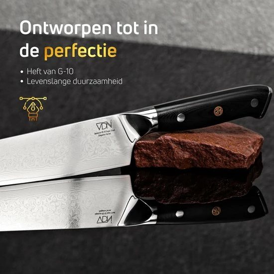 De VDN Elegance-serie bevat alle denkbare keukenmessen. Het lemmet van deze messen heeft een kern van sterk en roestvast VG-10-staal, met een hardheid van 60-62 HRC. Gesmeed door échte ambachtslieden en met precisie afgewerkt. Om de snij-kern heen bevinden zich 66 lagen Japans sierlijk damaststaal. Afgewerkt met een G-10 handvat uit Spanje. Door deze combinatie zijn de keukenmessen niet alleen zeer functioneel, maar ook ware blikvangers in je keuken.