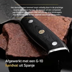Het damaststalen lemmet loopt volledig door in de prachtige zwarte designhandgreep, die bestaat uit een composiet van linnen en kunsthars. Met behulp van drie klinknagels zijn de handgreep en het lemmet aan elkaar verbonden.