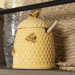 Landelijk Geel Honingpot met Lepel Voorraadpot Deksel Bewaarpot Opbergpot Bijen Keramiek Rond