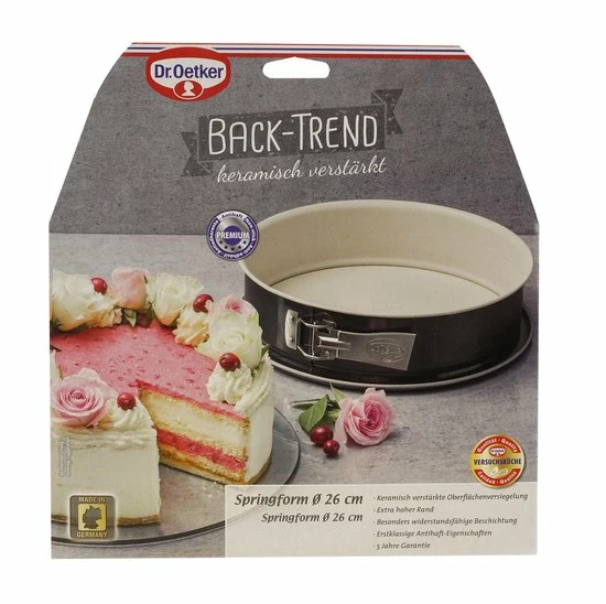 In deze springvorm van Dr. Oetker bak je perfecte taarten. De springvorm zorgt voor een goede verdeling van de ovenwarmte zodat je taart mooi en egaal gaart. En dankzij de sterke anti-aanbaklaag zijn je taarten na het bakken makkelijker uit de vorm te halen en is deze bovendien eenvoudig schoon te maken. De springvorm is voorzien van een lekbescherming en hittebestendig tot 230°C. Na gebruik maak je de springvorm schoon met warm water en wat sop. Op deze springvorm geldt 5 jaar fabrieksgarantie.