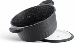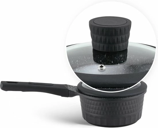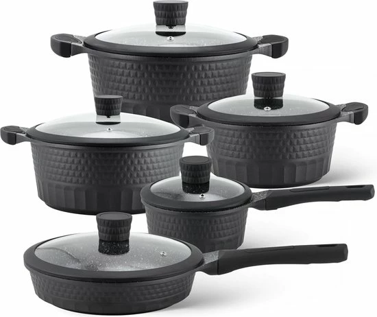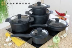 Deze prachtige pannenset van Edënbërg wordt geproduceerd onder de strengste Duitse normen en met het beste aluminium. De bodem is bedekt met maar liefst 3 lagen marmer met een mooie zwarte binnenkant die niet verkleurd. Dankzij de dikke bodem zijn de pannen zeer duurzaam en wordt het eten gelijkmatig verwarmd.