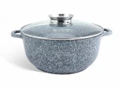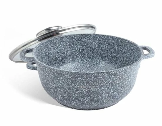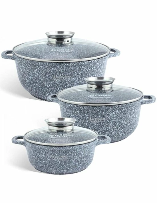Prachtige 6-delige pannenset van hoge kwaliteit. Een set gemaakt van hoogwaardig gesmeed aluminium en een marmeren coating. Door de marmeren coating bakken je gerechten absoluut niet aan. Tevens is deze pannenset voorzien van een antikleeflaag waardoor het mogelijk is om vetarm te koken. U kunt de pannenset veilig gebruiken in een afwasmachine. De pannen zijn geschikt voor alle warmtebronnen: elektrisch, gas, keramisch, halogeen en inductie. Daarnaast is het ook mogelijk om dit product in de oven te gebruiken ( zonder deksel )