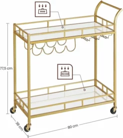 - Toon uw stijl: een chic goudkleurig frame, glazen leggers met spiegelglas, een elegant gebogen handvat… deze trolley op wieltjes geeft uw bar, eetkamer, keuken of andere ruimte een luxueus tintje