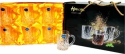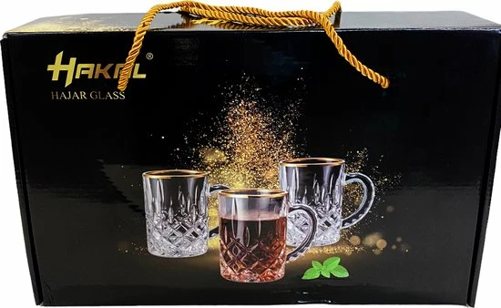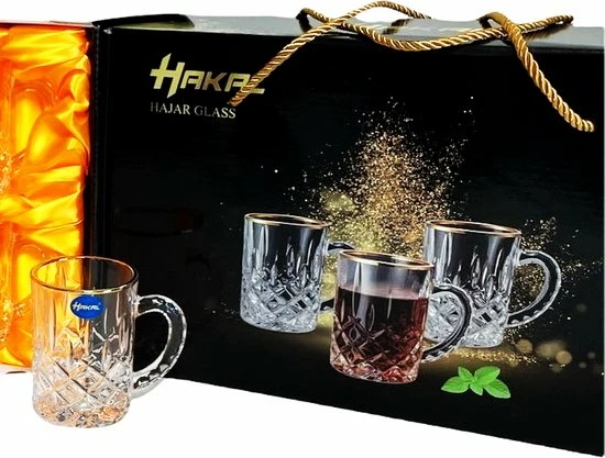 Glazen met oortje en een goudkleurig randje geschikt voor zowel koude als warme dranken. Deze glazen maken met hun opvallende gehoekte glasbewerking iedere drank bijzonder. Deze stoere glazen zijn gemaakt van extreem sterk glas en zijn perfect voor een feestje of dagelijks gebruik.
