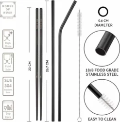 Inhoud: 1x Lepel, 1x Vork, 1 Mes, 1 paar Eetstokjes, 2x Herbruikbare Rietjes, 1x Reinigingsborstel Rietjes, 1x Opberghoes
