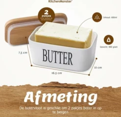 In elke KitchenMonster® botervloot passen maarliefst 2 pakjes boter. De botervloot met deksel heeft namelijk een inhoud van maarliefst 600 ml. Dit is meer dan gemiddelde botervloten, welke doorgaans maar 300 ml of 500 ml zijn. Met dit boterbakje heb je dus altijd genoeg ruimte voor je boter.