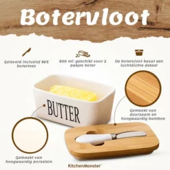 Het bakje van het botervlootje is gemaakt van hoogwaardig porselein. De deksel is gemaakt van bamboe hout. Op de rand van de deksel zit daarnaast nog een dubbele silicone strip om de boterschaal goed af te sluiten.