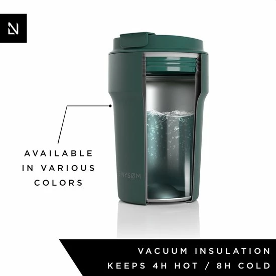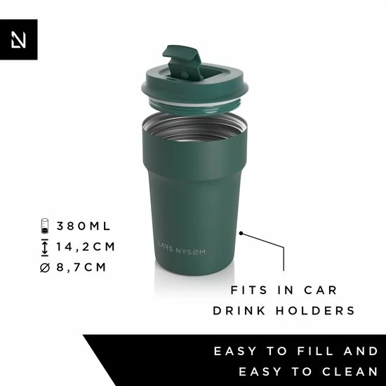 De geïsoleerde mok is ideaal voor uw koffietoevoer. De thermosbeker past in autodrankhouders, is lekvrij en gemakkelijk te vullen. De drinkopening is perfect om afgemeten te drinken zonder te morsen.