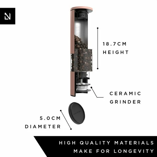 De hoogwaardige handmatige keramische molen is perfect voor zout, peper en specerijen en zorgt voor een optimale korrelgrootte van zeer fijn tot zeer grof. De peper- en zoutmolen heeft een hoogte van 18,7cm, Ø 5cm