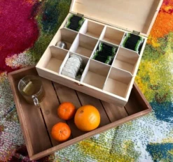 De 12 vaks theedoos meet 29 bij 25 centimeter, en is 8 centimeter hoog. Het geheel weegt 600 gram. De vakjes hebben precies de afmeting van de zakjes thee van bekende merken als bijvoorbeeld Pickwick, Lipton en Pukka. Het product wordt verzonden in een stevige verpakking.