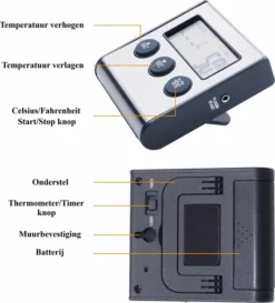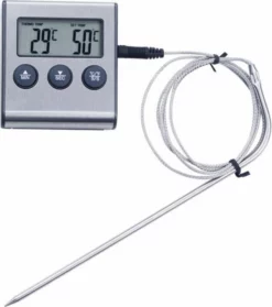 Door de stevige hittebestendige sonde is het mogelijk om de sonde in de oven te plaatsen en de juiste temperatuur te bekijken. Doordat de sonde 1 meter lang is, past deze in elke oven of BBQ. De achterkant van de thermometer is voorzien van meerdere systemen zodat deze gemakkelijk kan worden neergezet of opgehangen.