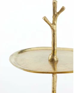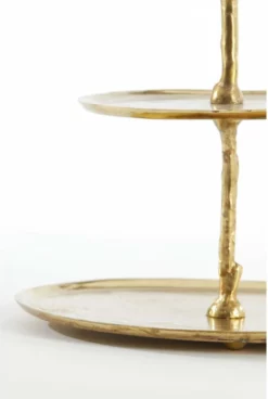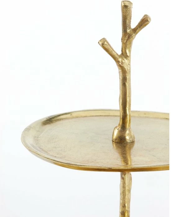 Etageres zijn multi functioneel. Leuk voor het serveren van lekkere hapjes en diverse zoetigheden zoals, koekjes en taartjes. Deze moderne etagere is perfect voor wanneer je visite krijgt. Deze gouden etagere met 2 lagen zal ook leuk staan op je eettafel met woonaccessoires, zoals theelichthouders. Dankzij de ruwe afwerking en de boomstam look valt hij extra op. Etagere Tresa van het merk Light & Living is gemaakt van metaal en heeft een hoogte van 31 cm en heeft een maximale breedte van 30,5 cm. (Niet geschikt voor in de vaatwasser)