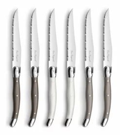 Deze 6 Lou Laguiole steakmessen in een houten kistje geven uw tafel een rustieke sfeer. De steakmessen hebben een mooi afgewerkt heft in de kleuren bruin, parelmoer en taupe. De steakmessen zijn vervaardigd uit hoogglans roestvrij staal en worden geleverd in een houten kistje. Door de gekartelde snede van het mes wordt snijden een makkelijke opgave en snijdt u het perfecte stukje vlees.