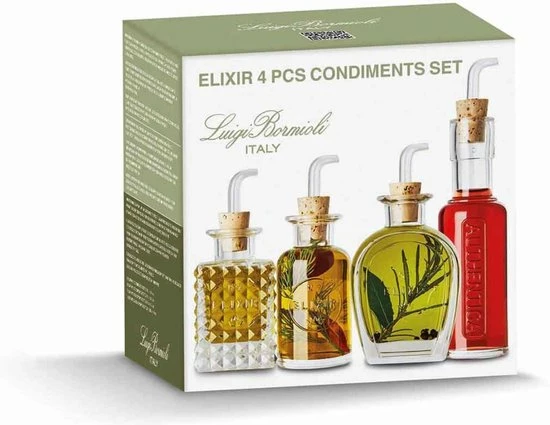 Olie- en azijnflessen zijn onmisbaar in de keuken en op iedere ingedekte tafel. Met deze Elixirset van Luigi Bormioli ben je meteen klaar. Deze set bestaat namelijk uit een 3 olie elixirs met een inhoudsmaat van 10 cl en één azijnfles in met inhoud van 12,5 c. Iedere elixir is voorzien van een handige schenktuit.