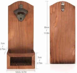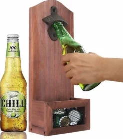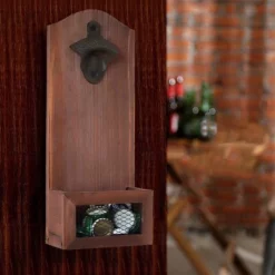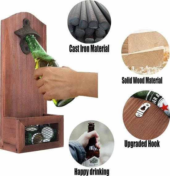 De flesopener is gemaakt met premium hout en een opener van roestvrij staal. Hierdoor is het geschikt voor binnen en buiten. Het hout geeft geen sterke geuren af en heeft een zachte rand. Het opvangbakje heeft een metalen gaas dat de dopjes droog houdt en de flesopener een rustieke stijl geeft.