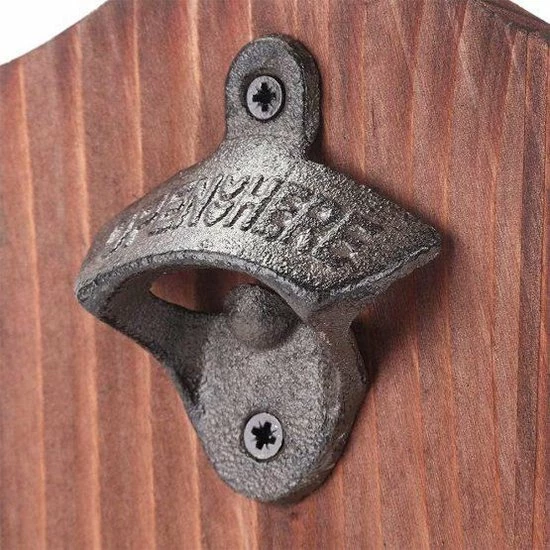 Het metalen haakje aan de achterkant van de flesopener hang je over een schroef (zit niet in verpakking). Zo kan je de flesopener ophangen aan een muur, hek, paal of waar je maar wilt.
