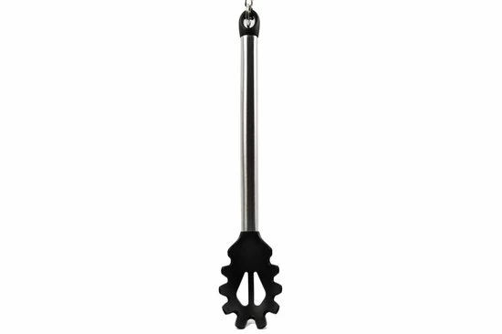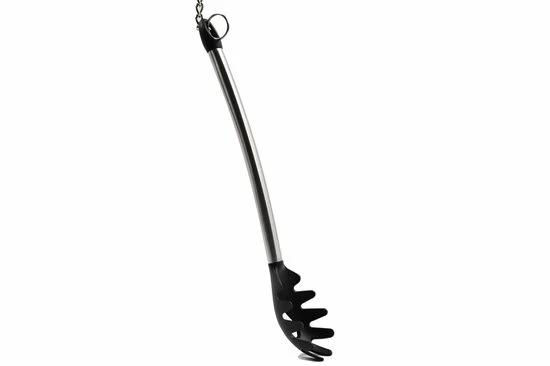 – De tang kunt u op meerdere manier gebruiken. Om eten op te scheppen maar ook tijdens het koken, om bijvoorbeeld uw vlees om te draaien in de pan.