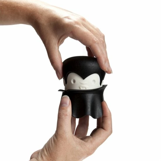Gracula knoflookpers van Ototo. Dit is een knoflookpers die eruit ziet als Dracula. Kleur: zwart met wit. De Gracula knoflookpers bestaat uit een hoofd en een bakje in de vorm van een cape. De knoflookteentjes worden uitgeperst door de tanden onder het hoofd. Stop de knoflook in het zwarte gewaad van de knoflook vampier, plaats zijn hoofd weer terug en draai één keer aan zijn hoofd. De knoflookteentjes zijn nu fijngemalen tot kleine stukjes. Vanuit het bakje is de knoflook snel en eenvoudig toe te voegen bij een gerecht. Gemaakt van polypropeen. Afmeting: 9,7 x 7,4 x 7,4 centimeter.