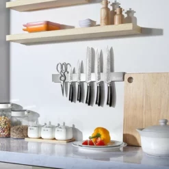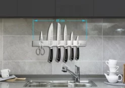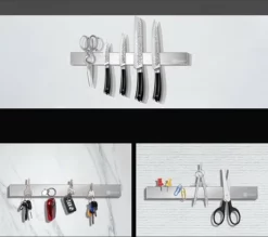 - De magneet van de messenhouder is zeer sterk. Je kunt tegelijkertijd meerdere messen, scharen, garde of ander keukengereedschap van metaal