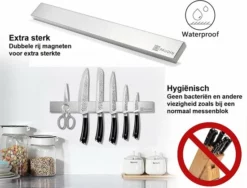 Deze magnetische messenstrip is vniet alleen een handig keukenhulpje voor hobbykok of barbeque liefhebber maar voor iedereen die een goede nette ordelijker en hygiënische manier zoekt om zijn messen een veilig plekje te geven.