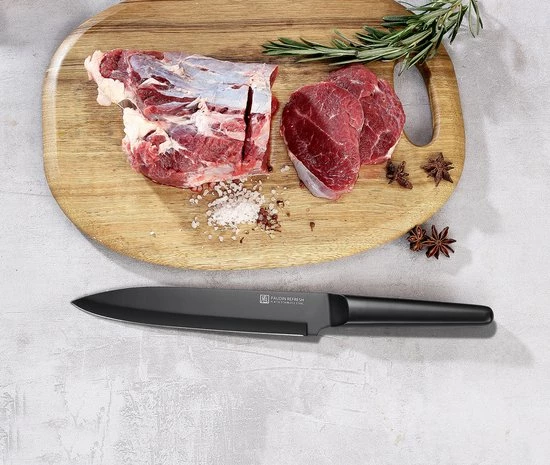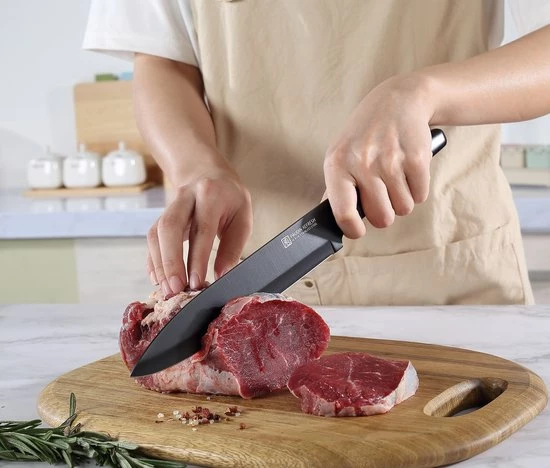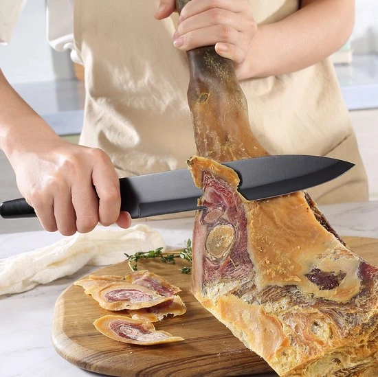 Deze zeer slijtvaste coating geeft dit mes een stoere en robuste uitstraling en zorgt er ook voor dat groenten en vlees en vis minder snal aan het mes blijven plakken. De keramische coating is zeer duurzaam maar is en blijft een coating. Eern uitgebreide test van 6 maanden elke dag op 70 graden in de vaatwasser laat slechts enkele kleine beschadigingen en roestpuntjes zien. Voor een langere levensduur liefst, zoals eigenlijk geld voor ieder koksmes, na gebruik met de hand afwassen en afdrogen met een zachte theedoek.
