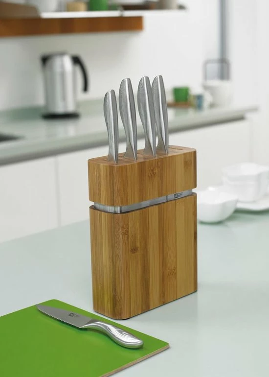 Het messenblok is geheel van bamboo en wordt geleverd inclusief een schilmesje, huishoudmes, koksmes, broodmes en een vleesmes.