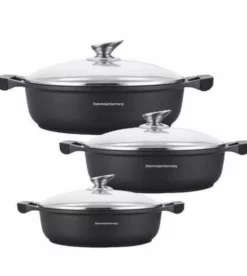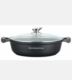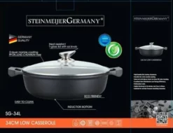 Braadpan-hapjespan 30 cm marmeren coating Merk: Steinmeijergermany Kleur: Zwart Inhoud: – Braadpan – Glazen deksel Afmeting: 30 cm doorsnede (bovenkant pan) Inhoud: 6 liter , ONDERKANT 24CM Wanneer gebruik je een braadpan? Deze pan is geschikt om een maaltijd in de bereiden of vlees in te braden voor een grote groep mensen. Zeer grote pan. Kan alleen op zeer grote pit of wokbrander. Marmeren coating: Dankzij de marmeren laag van deze braadpan bakt uw vlees niet aan. Ook is deze laag is gemaakt zonder PFOA. Gemakkelijk schoon te maken. Vorm: De soeppan / braadpan heeft een ronde vorm en een hoge rand. Deze braadpannen zijn verkrijgbaar in verschillende formaten, namelijk van 30 cm tot de grootste braadpan van Voordelen: Deze mooie braadpannen zijn een stuk duurzamer, ze kunnen beter hitte verdragen dus gaan langer mee. Koken met deze pan kan zonder boter of olie, door de gladde marmeren laag bakt niets aan en is de pan erg makkelijk schoon te maken. Ook komen er geen giftige stoffen vrij zoals bij Teflon pannen wel het geval is. Nog een voordeel van coating boven keramische coating is dat de marmeren laag zwart is waardoor hij minder snel zal verkleuren