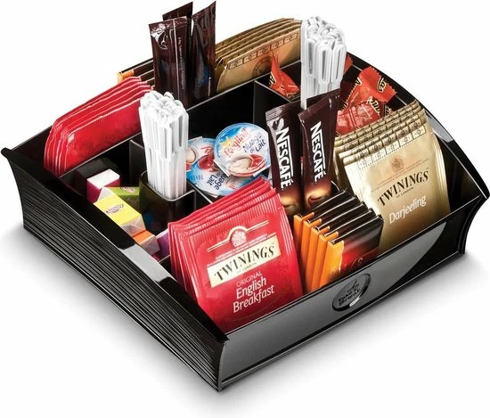 | Verpakkingsinhoud | Plateau, met, verschillende, vakjes, voor, theezakjes, koffiezakjes, suiker, melk, koekjes, roerstaafjes, enz., Uit, 100, %, recycleerbaar, polystyreen., Ft, 20, 5, x, 21, 6, x, 6, 8, cm., Kleur:, zwart., Compatibel, met, ladenblok, (ref., 1082561) |