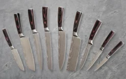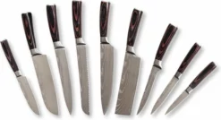 Omdat wij een set leveren met wel 9 verschillende koksmessen ben jij helemaal klaar voor alle gerechten uit alle keukens. Met de chefmes, snijmes, broodmes, hakbijl, grote en kleine santoku mes, uitbeenmes, utility mes en paring mes tover jij van elke gerecht een culinair moment. Daarnaast ontvang jij ook een vinger protectie, waardoor jij ook als beginneling gebruik kan maken van de vlijmscherpe messen.