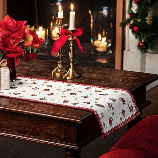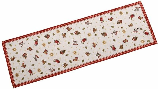 Met de collectie Toy’s Delight zorgt u voor een nostalgische kerstsfeer in huis. Het serviesgoed en bijpassende katoenen decoratieve accessoires zijn versierd met speelse motieven in rood, groen en wit en roepen mooie jeugdherinneringen op. Om te combineren, verzamelen en cadeau te doen. De grote Gobelin tafelloper met kerstmotieven past bij uw feesttafel of op de ladekast en zet bijzondere design-accenten. Breng een feestelijke kerstsfeer op tafel. Gemaakt van 70% katoen en 30% polyester.