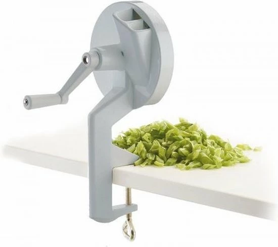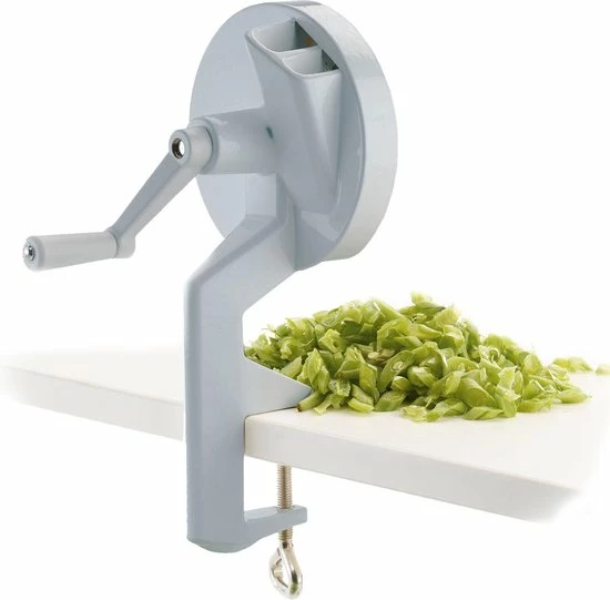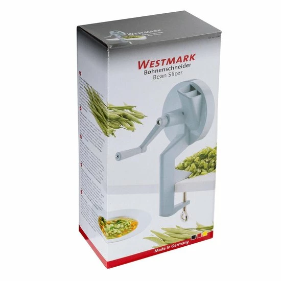 Een unieke hulp bij het snijden van bonen voor bijvoorbeeld een soep, een salade of als groentegerecht naast de bekende Hollandse aardappel. Deze handmatige bonensnijder van Westmark is zeer praktisch in gebruik. Het enige wat je hoeft te doen is je snijboon, sperzieboon of kousenband in de snijder te stoppen en vervolgens te gaan draaien aan het hendel. De bonen worden door de drie geharde en geslepen messen in mooie gelijkmatige stukken gesneden en zijn direct klaar voor bereiding. De stevige tafelschroefklem zorgt ervoor dat je stabiel kunt werken. Na gebruik is deze bonensnijder gemakkelijk schoon te maken met warm water en een sopje. De snijder is gemaakt van aluminium en heeft ultra scherpe RVS messen. De afmeting van deze bonensnijder is 12,3 x 14 x 26,5 cm.