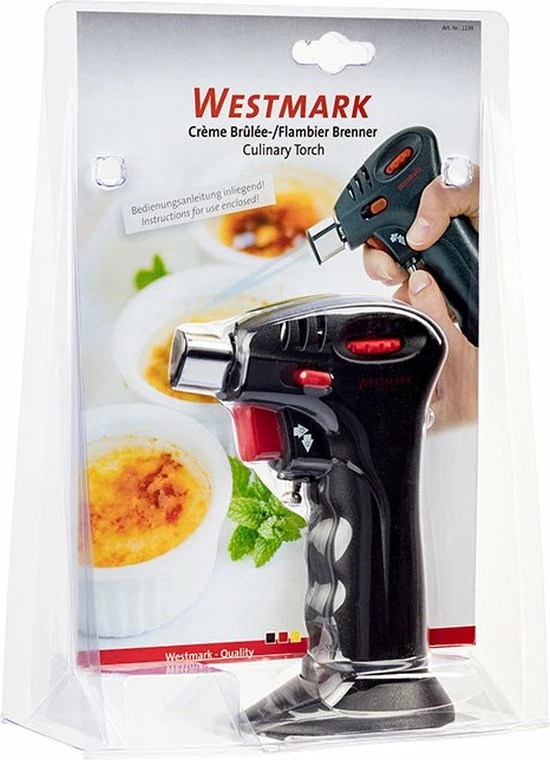 Nu kun je thuis ook genieten van de perfecte crème brûlée, want met deze brander van Westmarkis dit dessert een eitje om te maken. Deze brander karamelliseert de suiker op de Crème Brûlée mooi en gelijkmatig. De grootte van de vlam is instelbaar. Verras je gasten dus met jouw kookkunsten en tover een heerlijke crème brûlée op tafel. Deze brander is makkelijk met één hand te bedienen, bevat een kinderslot en is navulbaar met butaangas (niet inbegrepen). De afmeting van deze brander is 8 x 6 x 14,2 cm.