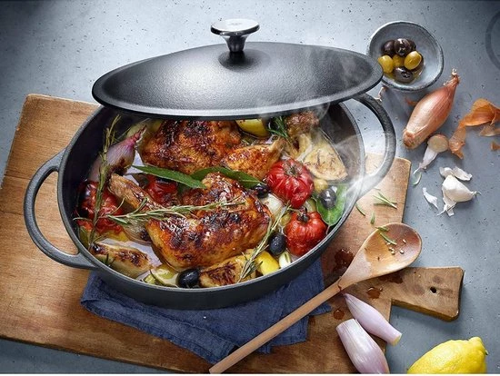 De rechthoekige of ovale braadpan met twee handgrepen is perfect voor het koken, braden en stomen van vis en vlees. De braadpan werkt echt alleen op grote hoeveelheden runderbeuk of hele vogels, zodat ze aan de buitenkant knapperig en succulent en zacht aan de binnenkant blijven. Om ervoor te zorgen dat het vlees gelijkmatig wordt gegaard, moet het worden afgedekt met een hittebestendig glas of metalen deksel. De braadpan is net zo thuis op het fornuis als in de oven en is geschikt voor alle warmtebronnen. Gemaakt van Cromargan roestvrij staal of gietijzer, houdt de warmte lang vast en verdeelt deze gelijkmatig door het rooster. Goed om te weten: de braadpan kan eenvoudig in de vaatwasser worden gereinigd.